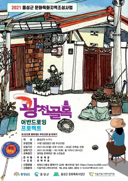 참가자는 10명 내외로 선착순으로 모집하며 광천의 골목을 기록하는 사업인 만큼 광천주민 5명에게 우선권을 부여할 예정이다.