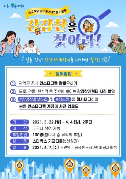 구는 참여자 중 100명을 무작위로 추첨해 5,000원 상당의 스타벅스 음료교환권을 증정하며 당첨자 발표는 4월 7일 관악구 공식 인스타그램에 공지할 예정이다.