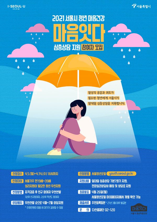 우울-불안, 관계, 스트레스, 무기력, 취업고민, 코로나우울 증상을 겪고 있거나, 마음건강 관련 심층상담이 필요한 서울시 거주 만19세~39세 청년이면 누구나 신청 가능하다.