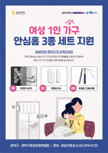 한편 구는 여성 1인 가구는 물론 모든 여성들이 편안하고 안심하게 지낼 수 있는 안전도시 조성을 위해 여성 1인 점포 안심벨 지원, 여성안심귀가 스카우트, 여성안심 택배함, 여성안심지킴이집, 불법촬영카메라 점검장비 대여서비스, 우리동네여성 안전반상회 개최 등 다양한 사업을 추진하고 있으며 관악경찰서 등 유관기관과 함께 여성안전 증진에 대한 종합적인 대책 마련을 위해 꾸준히 논의하고 있다.