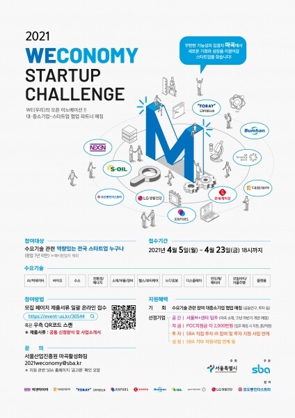 서울시와 서울산업진흥원이 마곡산업단지에 입주한 대기업과 중견기업의 우수한 역량·인프라와 혁신기술을 보유한 유망 스타트업을 매칭, 기술혁신 시너지를 통해 신산업 비즈니스 모델을 만드는 오픈 이노베이션 ‘2021 위코노미 스타트업 챌린지’를 연다.