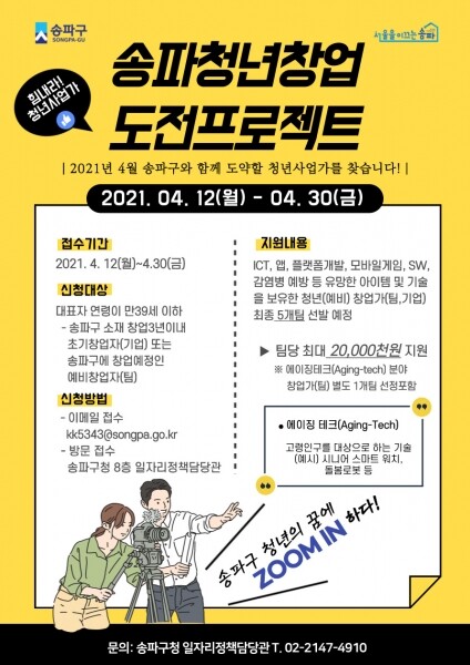 신청 절차 및 기타 문의는 송파구청 홈페이지 ‘고시공고’란에서 ‘도전’을 검색해 참고하면 된다.
