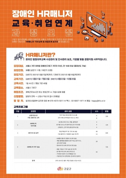 구로구는 “코로나19 상황으로 장애인은 구직 기회가 감소하고 기업은 장애인 의무 고용률을 달성하지 못하고 있다”며 “이에 G밸리 기업에 맞는 HR매니저 직무 교육을 제공하고 채용까지 연계하는 장애인 일자리 창출 사업을 펼친다”고 12일 밝혔다.