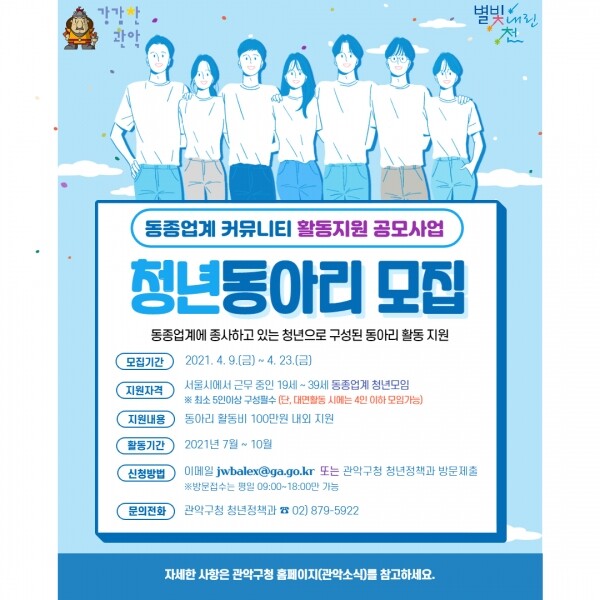 신청을 원하는 동아리는 관악구청 홈페이지에서 공고문을 확인한 후 사업신청서 등의 서류를 작성, 관악구청 청년정책과 방문 또는 이메일로 접수하면 된다.