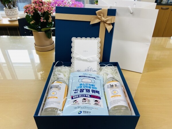 키트 구성품은 손세정제 2개, 마스크 20매로 완치 이후에도 감염 예방을 위한 노력을 통해 감염병 확산 차단에 동참해달라는 의미를 담았다.