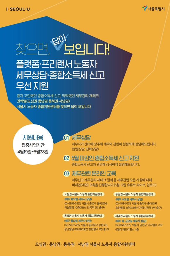 서울시가 세금신고에 어려움을 겪고 있는 플랫폼·프리랜서노동자를 위해 종합소득세 신고방법을 비롯한 각종 세무 상담을 시작한다고 밝혔다.