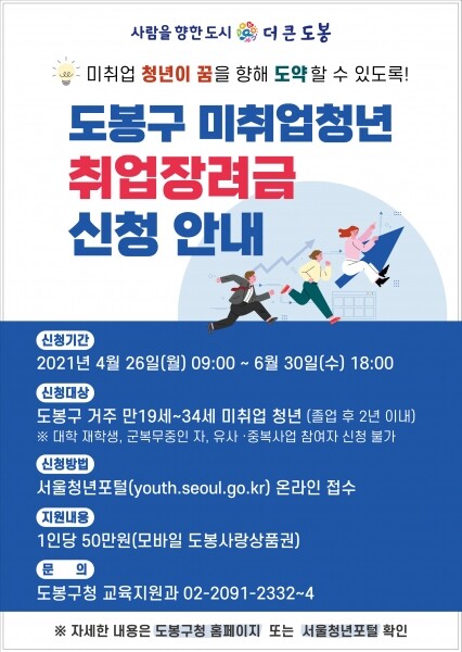 지원대상은 도봉구에 주민등록을 둔 만 19세에서 34세의 미취업 청년 중 최종학력 졸업 후 2년 이내인 사람이며 대학 재학생·휴학생·군복무 중인 사람은 제외된다.