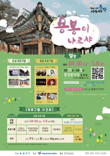 이순기 체육문화과장은 “5월 가정의 달을 맞아 과거 왕의 쉼터였던 용양봉저정에서 주민들께서 가족과 함께 다양한 역사·문화 체험프로그램을 체험하며 여가를 즐기시고 새롭게 단장한 용양봉저정 공원을 방문해 도심 속 자연 숲에서 힐링 하시기 바란다“고 말했다.