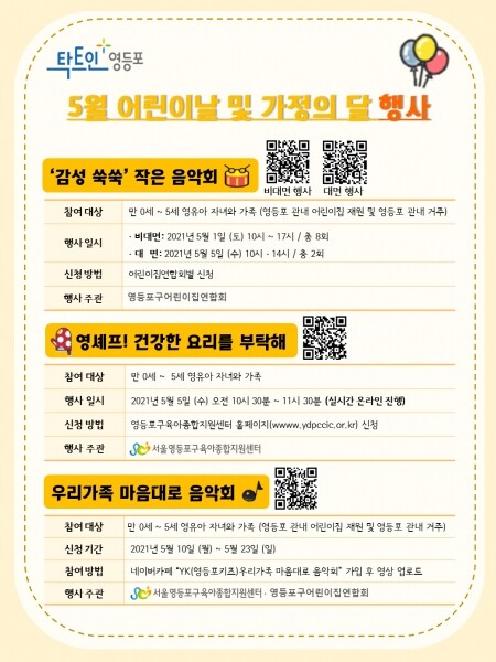 채현일 영등포구청장은 “코로나19 장기화로 대부분의 시간을 집에서 보내야 하는 아이들과 가족들을 위해 이번 행사를 준비했다”며 “어린이날의 주인공인 우리 아이들이 신나고 즐거운 5월을 보낼 수 있길 기대한다”고 전했다.