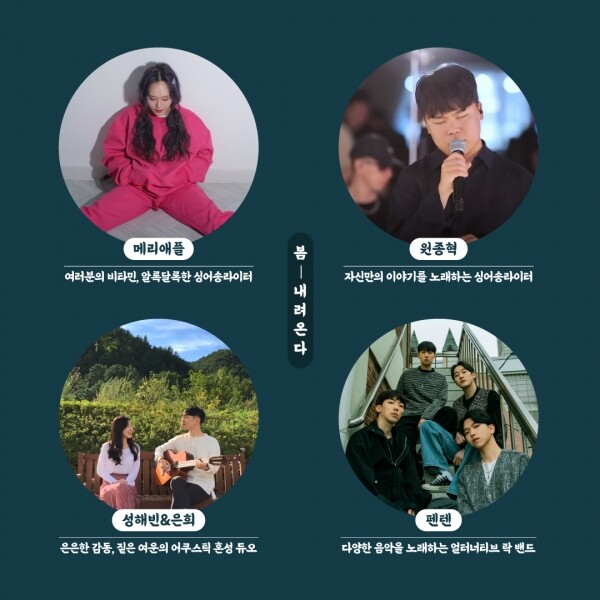 싱어송라이터 ‘메리애플’ 과 ‘원종혁’, 어쿠스틱 혼성 듀오 ‘성해빈&은희’, 남성 4인조 얼터너티브 락 밴드 ‘펜텐’ 총 4개 팀의 공연이 준비되어 있으며 청년 뮤지션과 청년 관람객이 온라인을 통해 약 두 시간 동안 소통하며 진행된다.