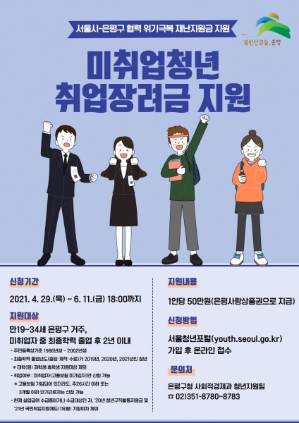 구 관계자는 “이번 미취업청년 취업장려금 지원이 청년들의 구직활동과 사회 참여기회 확대에 도움이 되고 은평구 지역경제 활성화에도 기여할 것으로 기대한다”고 말했다.
