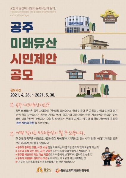 공모내용은 공주가 간직해 미래세대에 물려 줄 소중한 ‘미래유산’으로 문화재는 아니지만 중요한 문화적 자산이나 가치를 되새기고 보호할 필요가 있는 유·무형의 자산을 대상으로 한다.