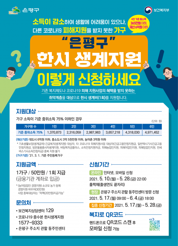 한시 생계지원 사업은 2019~2020년도 대비 올해 1~5월의 소득이 감소하고 기준 중위소득 75% 이하이며 재산이 6억원 이하인 가구가 대상이다.