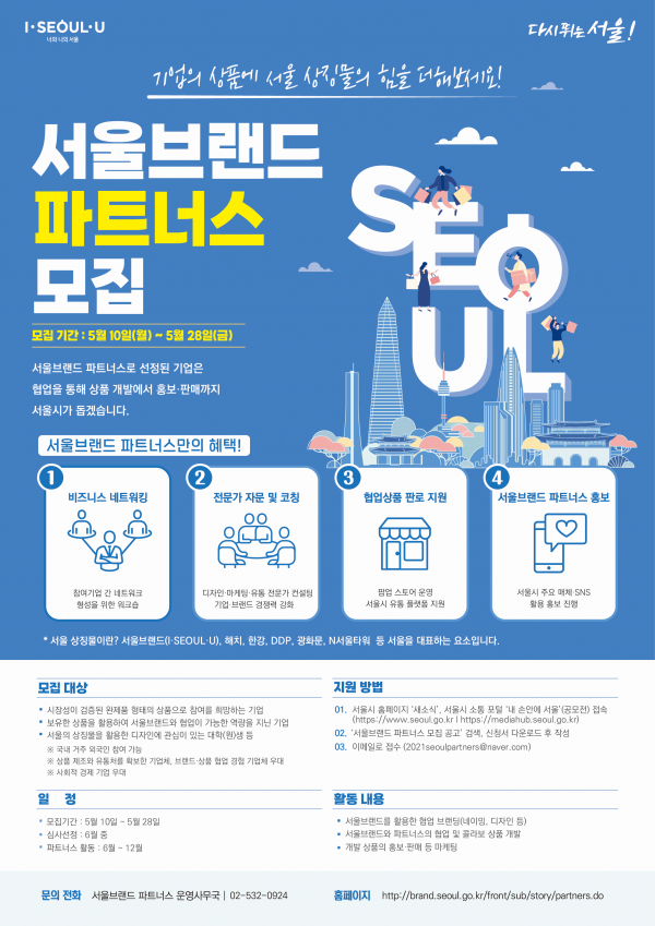 서울시는 5.10부터 5.28까지 ‘2021 서울브랜드 파트너스’ 20개 기업을 모집한다고 밝혔다.