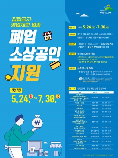 지원대상은 은평구에서 집합금지·영업제한 대상 사업장을 운영하다 폐업한 소상공인으로 중앙재난안전대책본부의 사회적 거리두기가 강화된 지난 2020년 3월 22일부터 올해 5월 23일 기간 중 폐업했으며 폐업 전 90일 이상 영업한 업체이다.