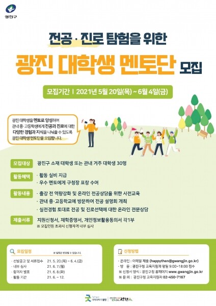 김선갑 광진구청장은 “이번 대학생 멘토단을 통해 진로 탐색 과정을 거친 대학생들이 후배들을 위해 경험을 공유하고 지역사회에 봉사하는 뜻깊은 시간을 보내길 바란다”며 “자라나는 청소년들이 다양한 경로를 통해 진로를 고민하고 미래를 계획할 수 있는 교육 환경을 조성해나겠다”고 말했다.