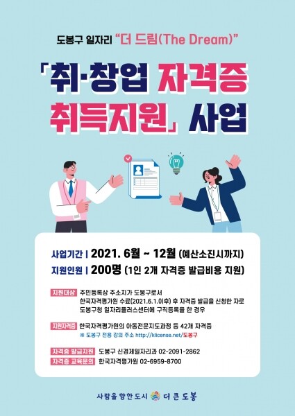 지원기간은 6월부터 12월까지이며 지원대상은 200명으로 1인당 2개의 자격증 발급비용을 지원해 준다. 지원 요건으로는 주민등록상 주소지가 도봉구이며 한국자격평가원 수료(2021년 6월 1일 이후) 후 자격증 발급을 신청한 자로서 도봉구청 일자리플러스센터에 구직등록을 한 경우이다.