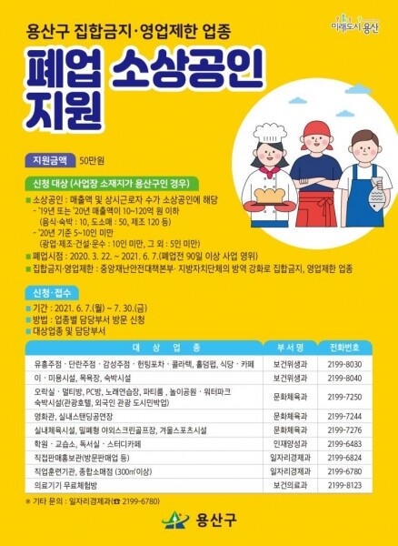 지원대상은 공고일 기준 폐업 전 사업장 소재지가 용산구인 집합금지·영업제한 업종의 폐업 소상공인이다.
