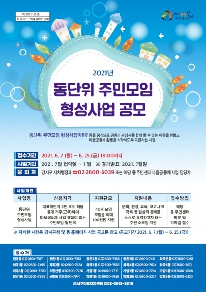 서울 강서구는 ‘동단위 주민모임 형성 공모사업’에 참여할 대상자를 오는 25일까지 모집한다고 밝혔다.