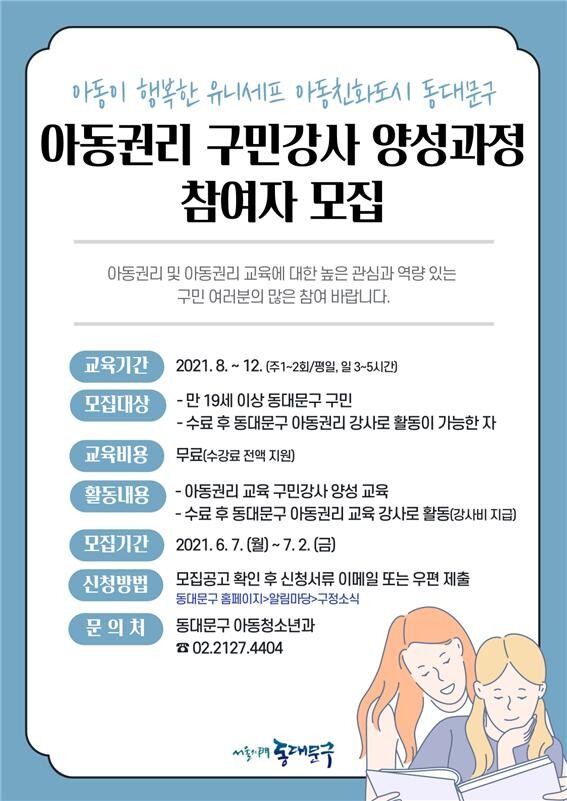 ‘아동권리 교육 구민강사 양성과정’은 오는 8월 2일부터 12월 8일까지 주 1~2회, 하루 3~5시간 씩 총 85시간 교육으로 진행되며 교육비는 전액 무료다.