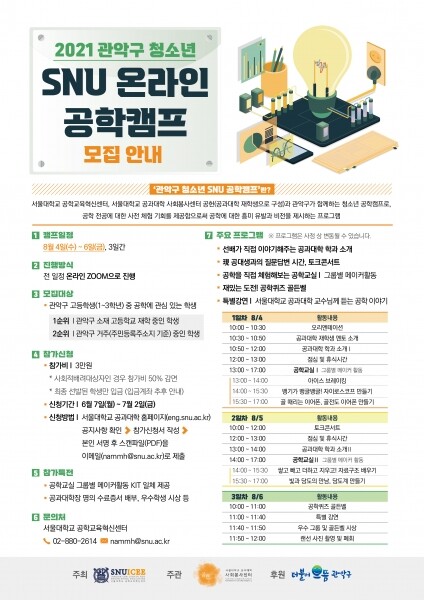 올해 캠프는 코로나19 장기화로 인해 오는 8월 4일부터 6일까지 전 일정을 ZOOM을 활용한 온라인 캠프로 진행하며 서울대 공과대학 교수진 및 연구원이 참여하고 재학생들이 멘토가 되어 전 일정을 함께 한다.