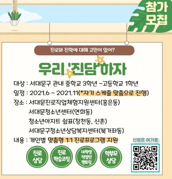 ‘진담 프로그램’은 서대문진로직업체험지원센터 서대문청소년센터 서대문구청소년상담복지센터 청소년아지트 쉼표 등 4곳에서 열린다.