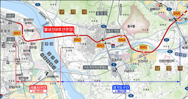 도시철도 8호선 연장구간은 현재 운행 중인 지하철 8호선 종점역인 암사역을 시작으로 한강 하부를 통과해 구리시 구간을 지나 남양주시 별내읍까지 12.906㎞에 구리역, 별내역 등 환승정거장 2개소를 포함한 정거장 6개소가 설치되며 총 사업비는 1조 3,403억원이다.