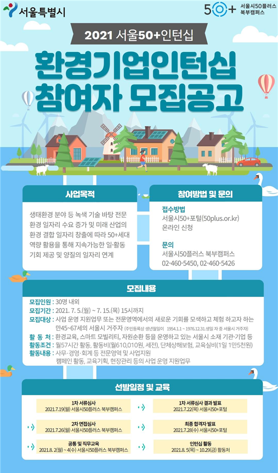 서울시50플러스재단은 미래 유망 산업으로 꼽히는 환경 분야에서 50+세대가 지속가능한 일·활동을 탐색해 볼 수 있는 ‘환경기업인턴십’ 사업을 마련하고 5일부터 참여자를 모집한다.