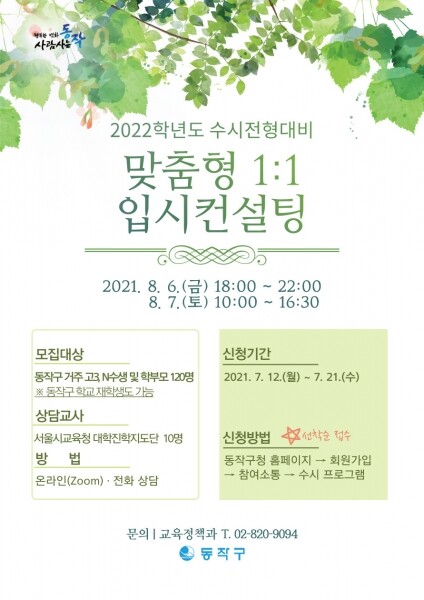 참여대상은 동작구 거주 대입 수험생 및 학부모 120명으로 이달 21일까지 구청 홈페이지를 통해 선착순 모집한다.