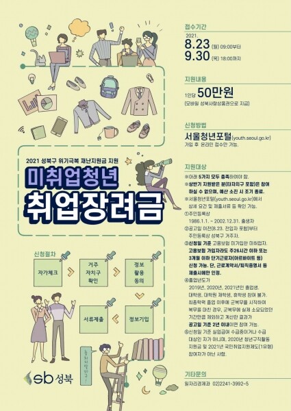 공고일 기준 주민등록상 성북구 거주 1986년생 ~ 2002년 출생자 최종학력 졸업 후 2년 이내 고용보험 미가입자 실업급여, 국민취업지원제도 등 중복참여가 아닌 자 신청은 오는 23일부터 다음달 30일까지 서울청년포털에서 상세요건 및 제출서류를 확인할 수 있다.