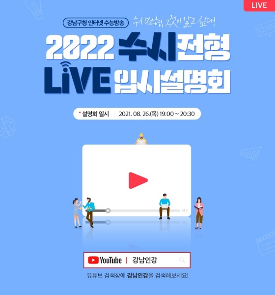 먼저 26일에는 강남구청 인터넷수능방송이 이만기 유웨이교육평가연구소장을 초청해 ‘2022 수시전형 Live 입시 설명회’를 개최한다.