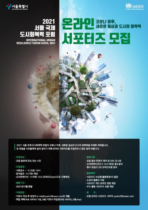 ‘도시회복력 포럼 서포터즈’는 9월 한 달 동안 홍보 콘텐츠 제작 및 SNS 포스팅을 통해 포럼 사전홍보를 진행하며 행사 당일 포럼에 참석해 실시간 온라인 참여 이벤트를 독려한다.