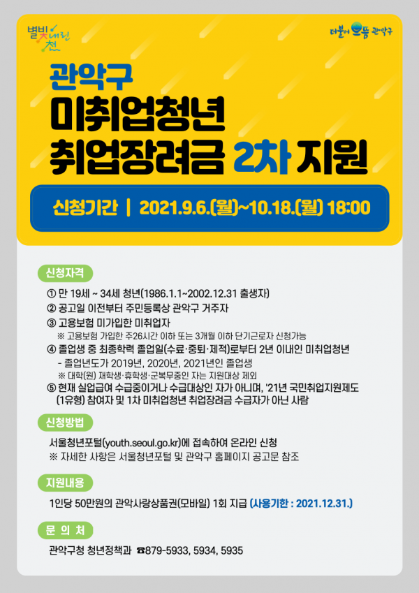 한편 구는 지난 5월 실시한 1차 미취업청년 취업장려금을 통해 2,399명을 지원했으며 2차 지원으로 더 많은 청년들이 혜택을 받을 수 있을 것으로 기대하고 있다.