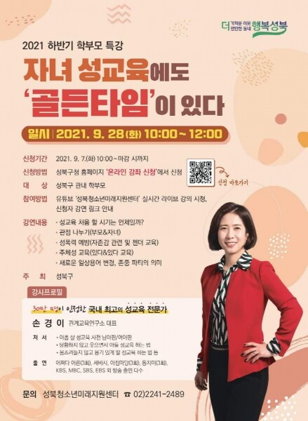 이번 성북구청 2021 학부모 특강은 ‘자녀 성교육에도 골든타임이 있다’라는 주제로 학부모들이 품는 자녀 성교육 시기에 대한 의문을 해소하고 바람직한 성교육 및 자녀 양육법을 공개한다.