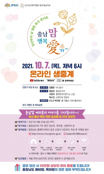 전문가 답변에는 양 지사와 서천석 행복한아이연구소 소장, 박수진 홍성의료원 산부인과 과장, 충남 저출산 극복 홍보대사로 활동 중인 그룹 V.O.S 소속 가수 박지헌 씨 등이 참여한다.