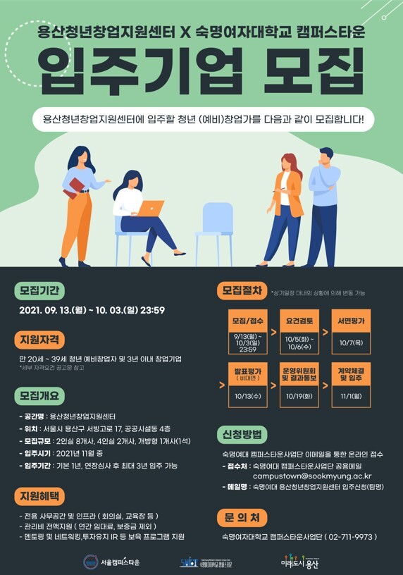 입주승인 신청서 사업계획서 등을 작성해 숙명여대 캠퍼스타운사업단 이메일로 접수하면 된다.