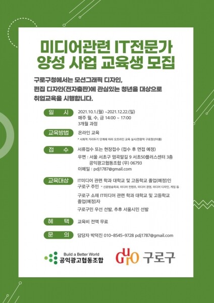 모집 대상은 신문방송학과, 미디어 콘텐츠, 미디어 디자인 등 IT 미디어 관련 학과의 대학교나 고등학교를 졸업한 구로구 주민이나 관내 소재 IT 미디어 관련 학과의 대학교나 고등학교를 졸업한 자다.
