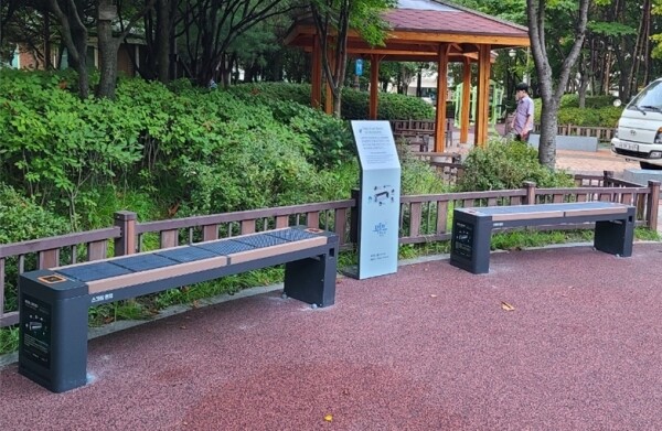 ‘태양광 스마트 벤치’는 좌석 부분에 태양광 패널이 설치되어 있어, 일조량이 많은 낮에 태양에너지를 배터리에 저장했다가 야간에 LED 조명을 밝히고 스마트폰 등 전자 기기의 유·무선 충전도 할 수 있는 친환경 시설물이다.