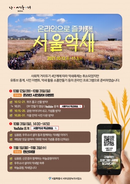 10.31 오후 2시~14:50 ‘서울억새 특급배송’ 유튜브 중계를 통해 심용환의 하늘공원 이야기, 우주소녀 설아의 억새밭 하루 등이 영상으로 제공될 예정이며 댓글 참여자 100명에게는 억새 굿즈를 배송할 예정이다.