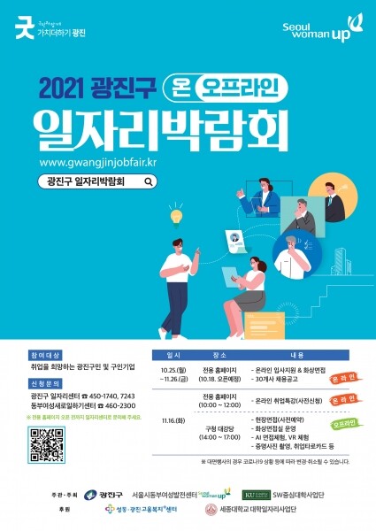 한편 오프라인 박람회는 11월 16일 오후 2시부터 오후 5시까지 광진구청 대강당에서 열리며 온라인 취업특강 소규모 대면 및 화상면접 AI/VR체험 증명사진 촬영 등 이벤트 부스 등이 운영된다.